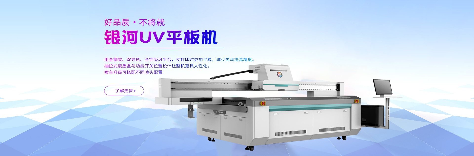 銀河BL系列UV板卷機(jī),采用全鋼架、直線導(dǎo)軌、優(yōu)質(zhì)網(wǎng)帶,超寬鋁合金臺面,使打印時更加平穩(wěn),減少晃動提 高精度。噴車升級可搭配不同噴頭配置,最適合自己,便是最好。 榮耀上市,煥然一新。
